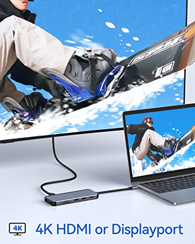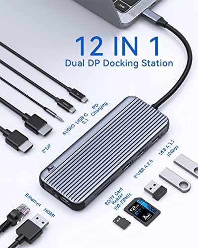 LIONWEI - محول قاعدة شحن USB C إلى منفذ عرض مزدوج 4K، 12 في 1 من ليونوي، منفذ USBC 10 جيجابايت في الثانية مع 2 DP وHDMI وUSB 3.1 ومنفذ ايثرنت وصوت وفتحة SD/TF 4.0 للاب توب ثاندربولت