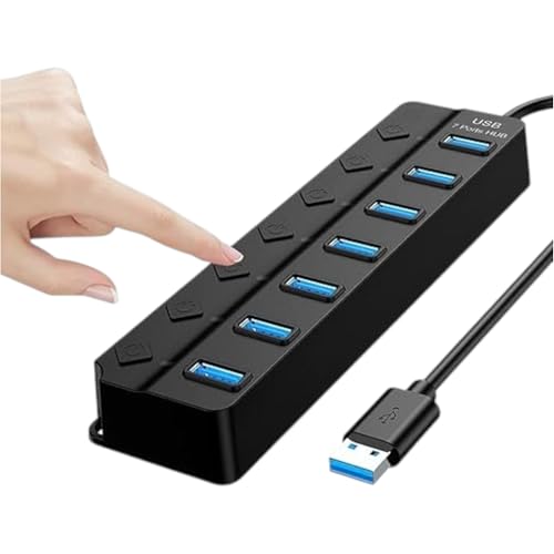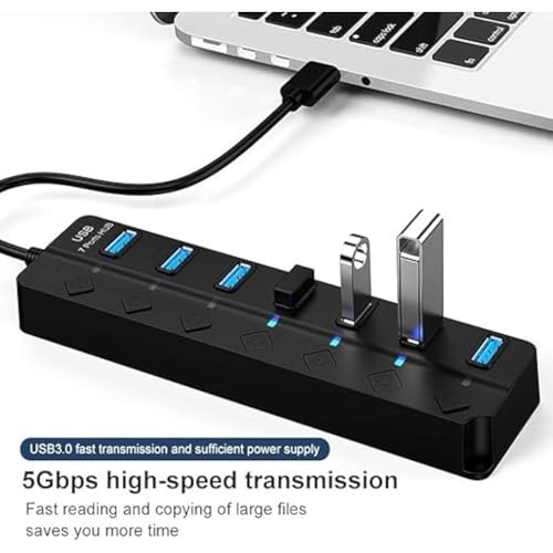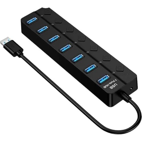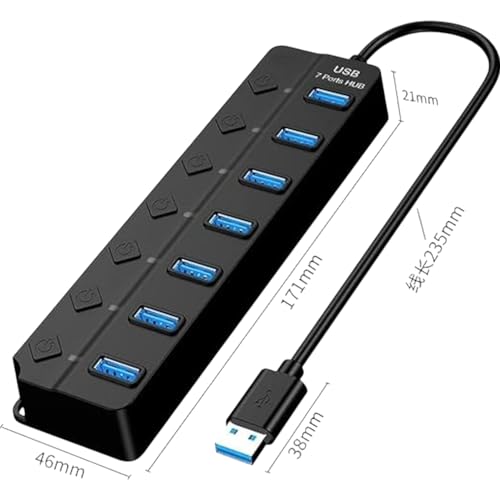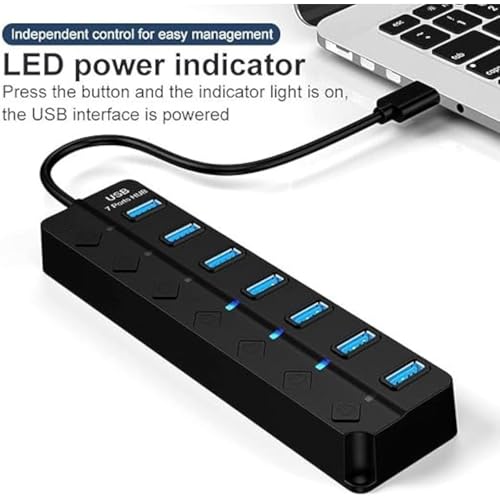 Generic - محول موزع USB رفيع للغاية يدعم الطاقة والبيانات وإضاءة ليد متعدد المنافذ للاب توب والكمبيوتر وماك بوك وفلاش ميموري والموبايل والماوس والكيبورد والكمبيوتر المكتبي وكابل تمديد 30 سم (أسود، منفذ 2.0/7)