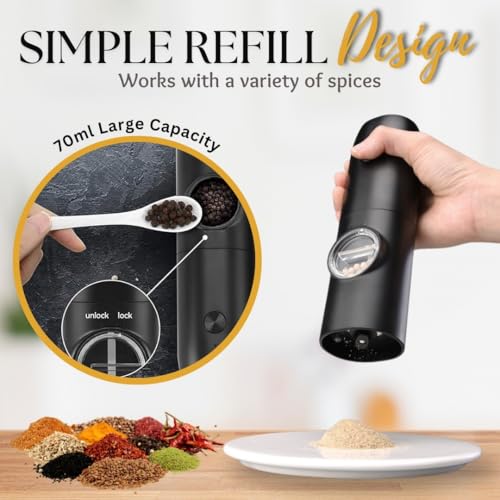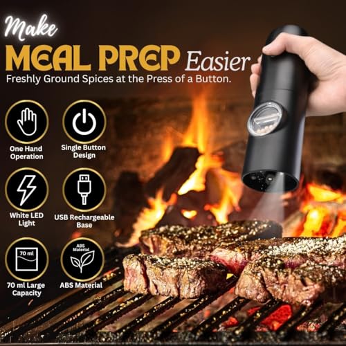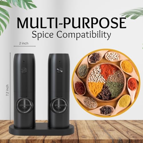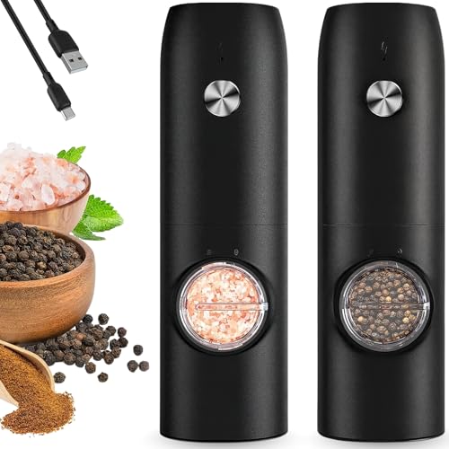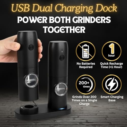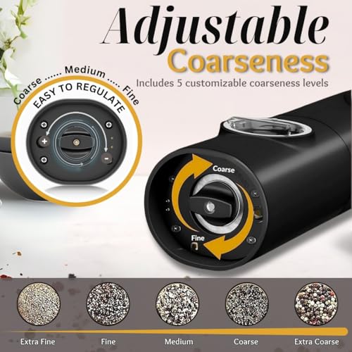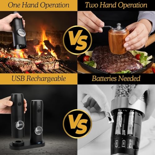 HEARTHLY - مجموعة مطحنة ملح وفلفل كهربائية من هيرثلي، مطحنة تعمل بالبطارية قابلة لإعادة الشحن مع قوة طحن قابلة للتعديل، ضوء ليد، طحن تلقائي بيد واحدة، قاعدة مزدوجة وفرشاة تنظيف (أسود)