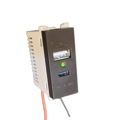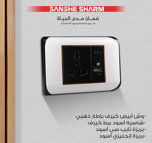 Sian Tech - وحدة شاحن USB+ Type C مزدوجة، مع مؤشر LED أخضر- 5V – 2.1A ، تركيب مدمج، أسود مط - مع شاسية وم عدد2 سدادة اسود مط مع وش اسود مط - سانشي شرم