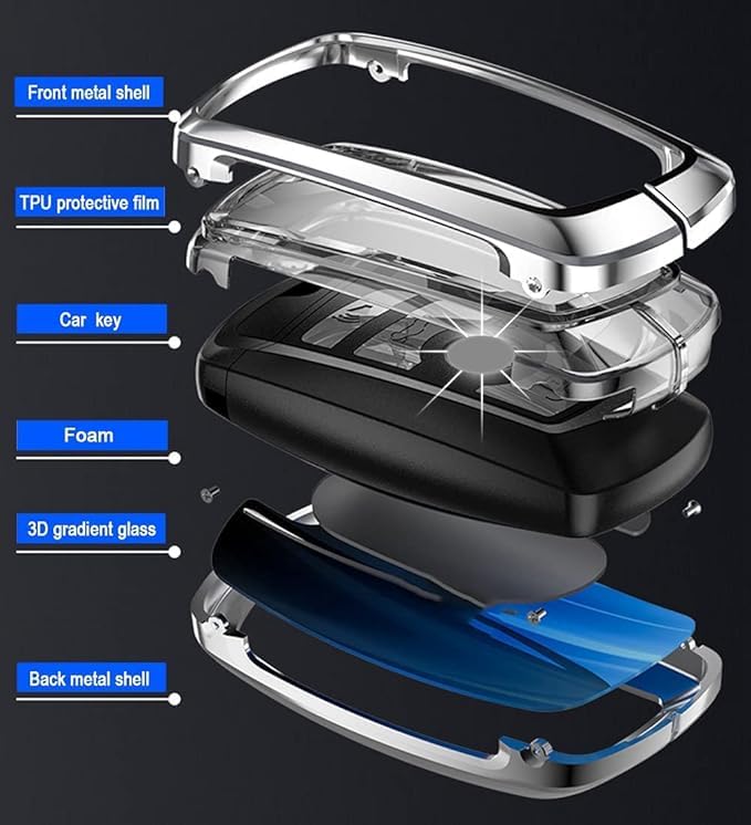 - ٢) حماية شاملة: طبقات متعددة تشمل غلاف معدني أمامي وخلفي، فيلم حماية TPU، ورغوة داخلية لحماية المفتاح من الصدمات والخدوش
