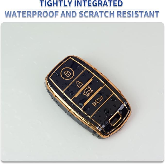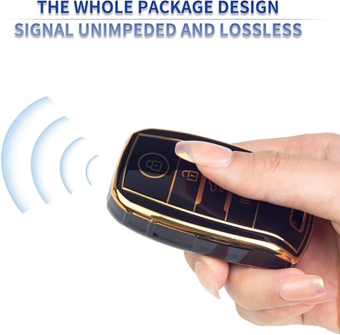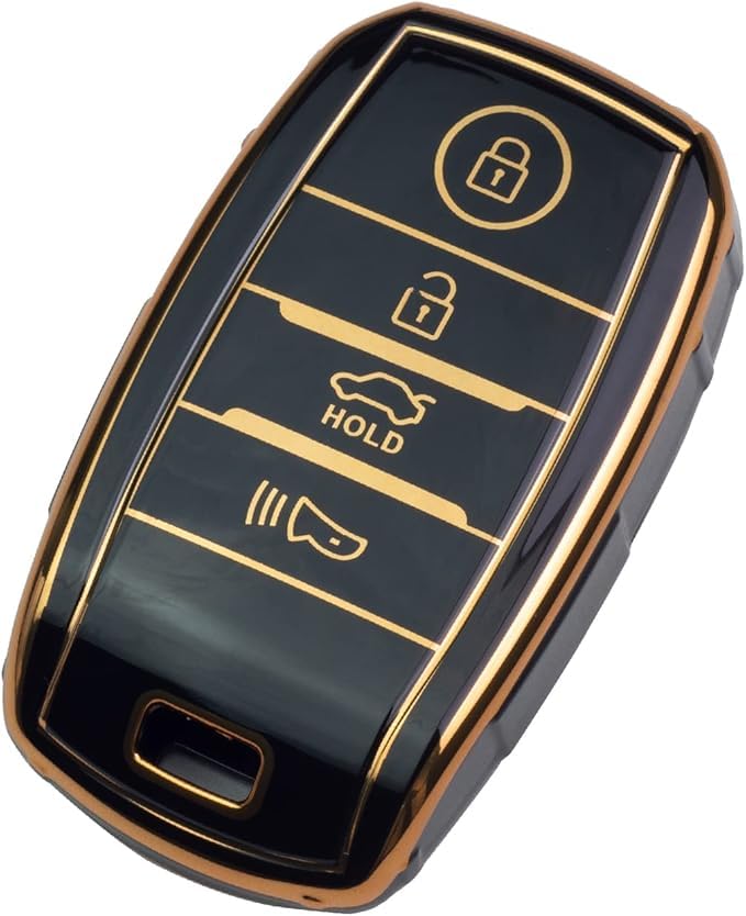 - ٢) تصميم أنيق: غطاء أسود مع حواف ذهبية يضيف لمسة فاخرة لمفتاح سيارتك