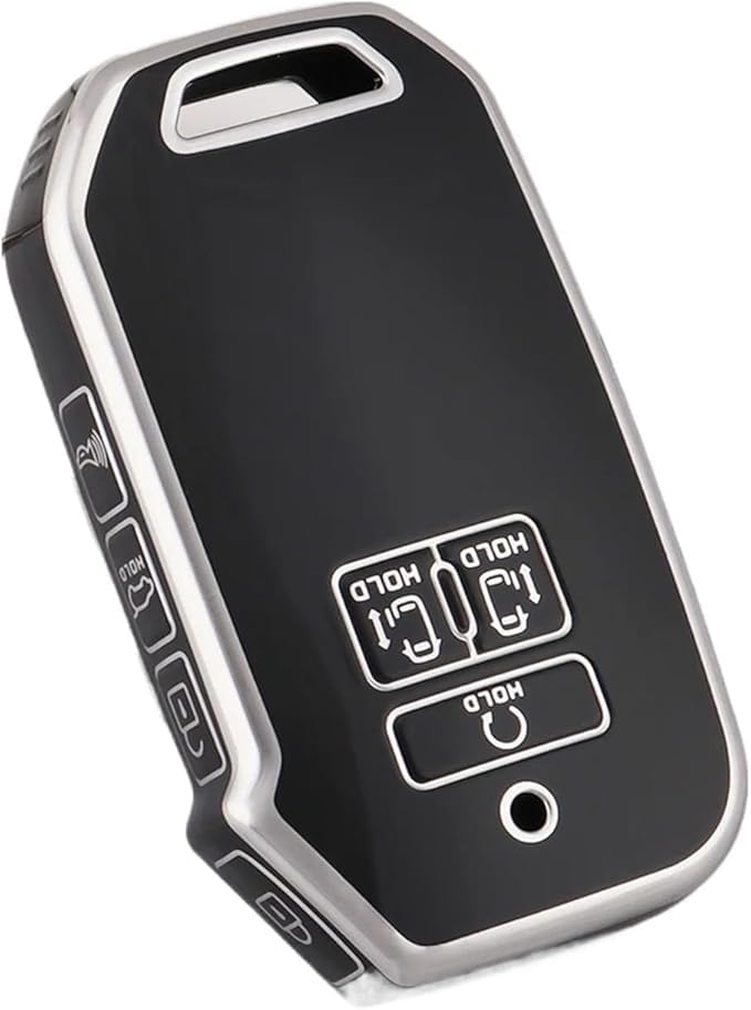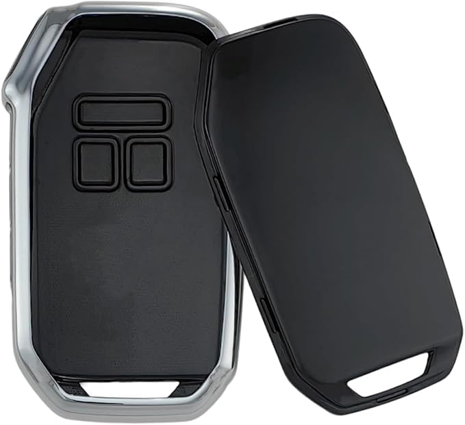 - تصميم فاخر: جراب مفتاح سيارة بتصميم عصري مع إطار فضي لامع وسطح أسود أنيق