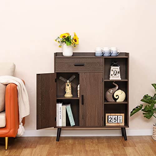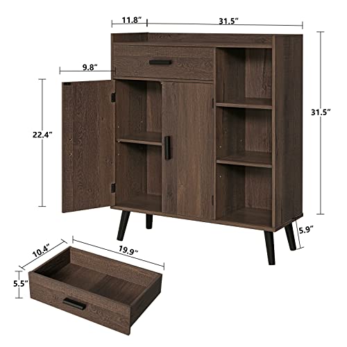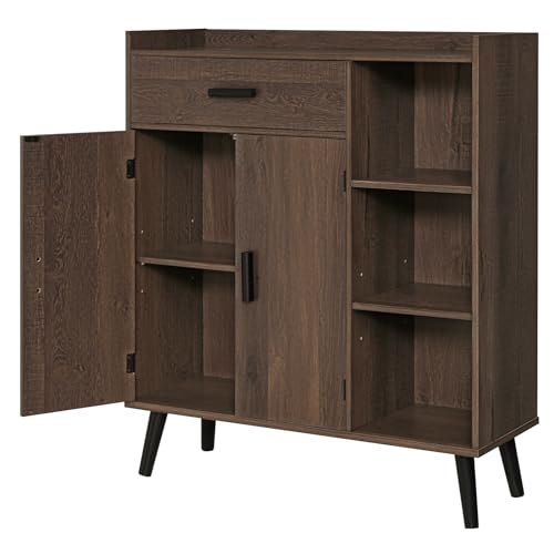usikey - دولاب تخزين طويل بارتفاع 94 سم مع درج واحد وبابين من يوسيكي، أرضي بتصميم بطابع منتصف القرن 3 رفوف، لغرفة المعيشة والمكتب المنزلي، خشب البلوط الداكن، أزرق