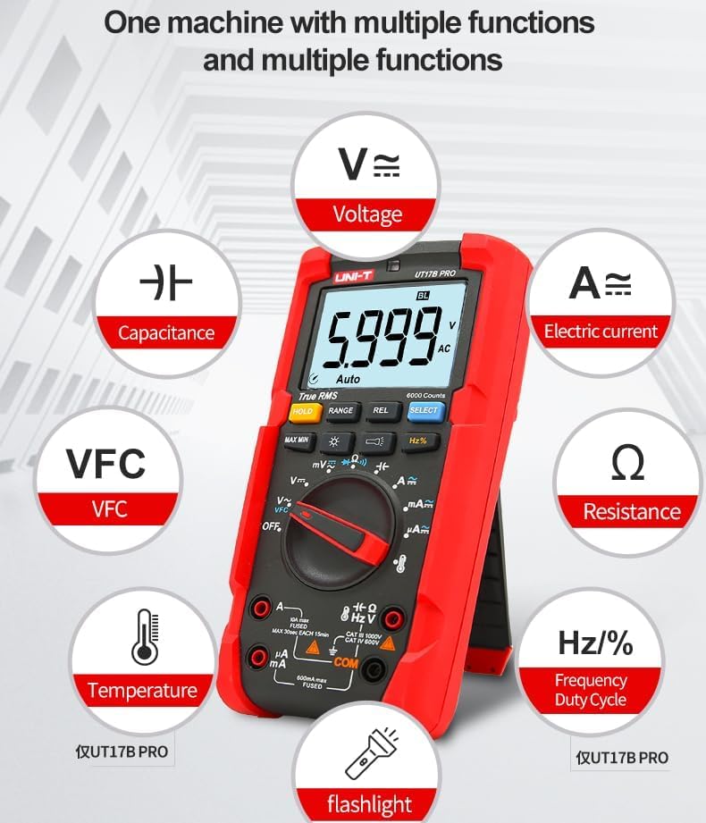 - مقياس متعدد الوظائف (UT18B برو) يعطي قراءة دقيقة حتى مع موجات غير نقية ويحدد النطاق أتوماتيكيًا مع حماية ضد الاحتراق ووظيفة قياس الجهد VFC، وكذلك يقيس المكثفات والمقاومات للاستخدام من قبل الفنيين والكهربائيين.