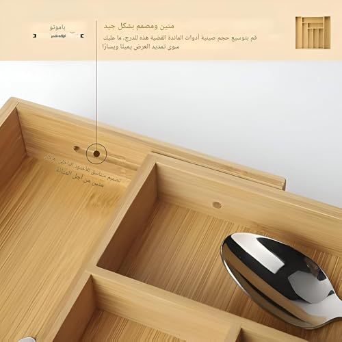 - تم تصميم منظم الأدراج المصنوع من الخيزران لتخزين وتنظيم أدوات المائدة مثل الشوك والسكاكين والملاعق، مما يجعله حلاً مثاليًا لإزالة الفوضى في أدراج المطبخ.