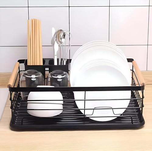 Generic - حامل أدوات مائدة - رف تجفيف مطبخ متعدد الوظائف مزود بصينية تَنقيط قابلة للفصل، وإطار مقاوم للتآكل، ومقابض جانبية خشبية توفر الثبات والجاذبية لمساحات غسل الأطباق المزدحمة
