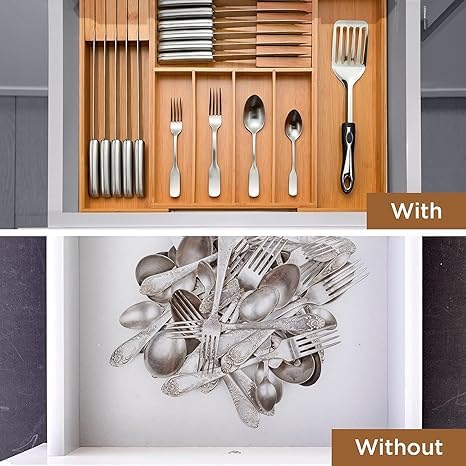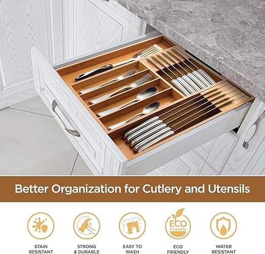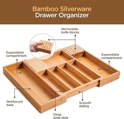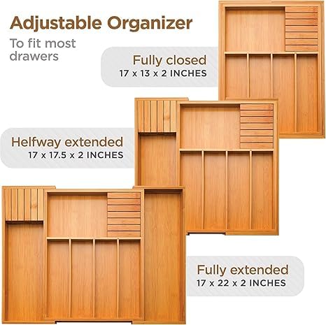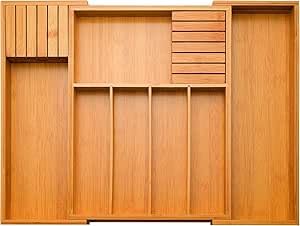 Generic - منظم ادوات المطبخ لادراج المطبخ - منظم ادوات مائدة قابل للتوسيع من الخيزران - حامل ادوات مائدة وصينية ادوات مائدة مع فاصل وسكين قابل للازالة | طول 17 انش، قابل للتعديل من 13 انش الى 22.2 انش
