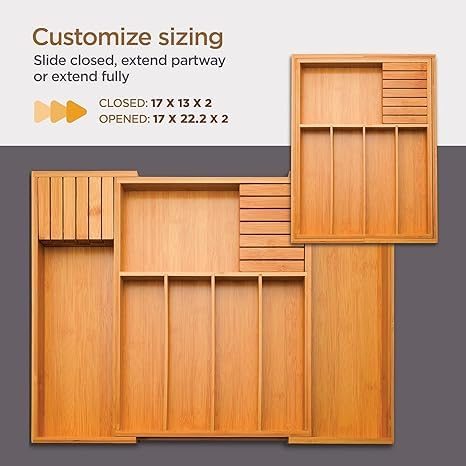 - قابلة للتوسيع لملاءمة مخصصة - تناسب الأقسام العريضة من صينية الأواني الفضية للدرج بسهولة المجموعات الكبيرة أو الأدوات الكبيرة. نظرًا لأنه قابل للتوسيع، يمكنك اختيار مقاسه ضيق يصل إلى 13 انش، وعرضه 22.2 انش، أو أي مقاس بينهما. يجب أن يكون الدرج الخاص بك في أصغر 13 انش × 17 انش في الداخل وعمق 2 انش. رائع كمنظم أدوات لأدراج المطبخ