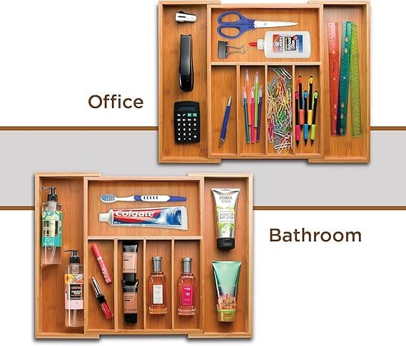 - منظم أدراج قابل للتعديل - ستحب كيف يتكيف المقاس مع ملاءمة درجك عن طريق تمديد أو تضييق العرض من 5 إلى 7 أقسام. رائع كمنظم درج للأدوات الفضية أو لتنظيم غرفة النوم أو الحمام أو المكتب.