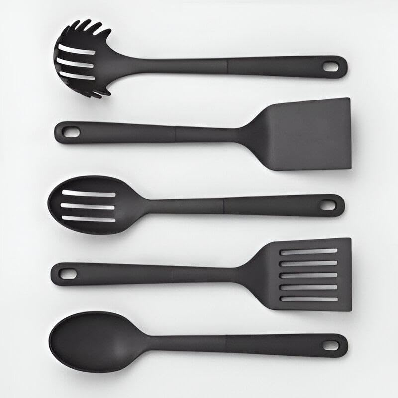 - مجموعة من 5 أدوات مطبخ متينة باللون الرمادي، بما في ذلك الملعقة والمغرفة وملعقة المعكرونة والملاقط، مصنوعة من البولي أميد المقوى لاحتياجات الطبخ اليومية.