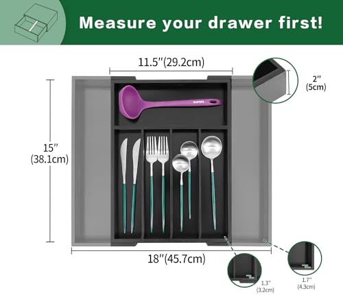 - تعديل مرن للمقاس: مع عرض قابل للتعديل بين 29.2 إلى 18 انش، منظم أدوات المطبخ الخاص بنا مناسب للأدراج ذات الأحجام المختلفة. عند فتحها بالكامل، تبلغ أبعاد صواني أدوات المائدة 45.7 × 38 × 5 سم؛ عند إغلاقها بالكامل، يكون حجمها 29.2 × 38.1 × 5 سم. لذا بغض النظر عن حجم درجك، فإن منظم درج أدوات المائدة الخاص بنا يناسب بشكل جيد