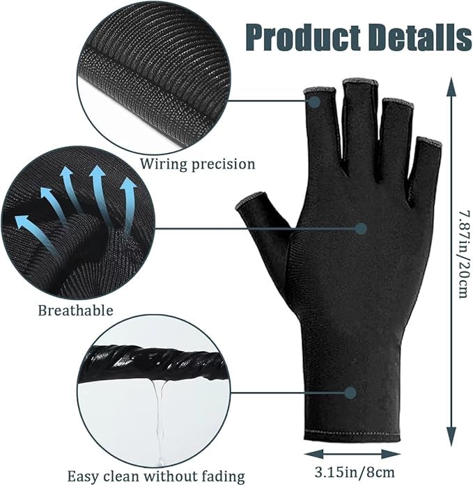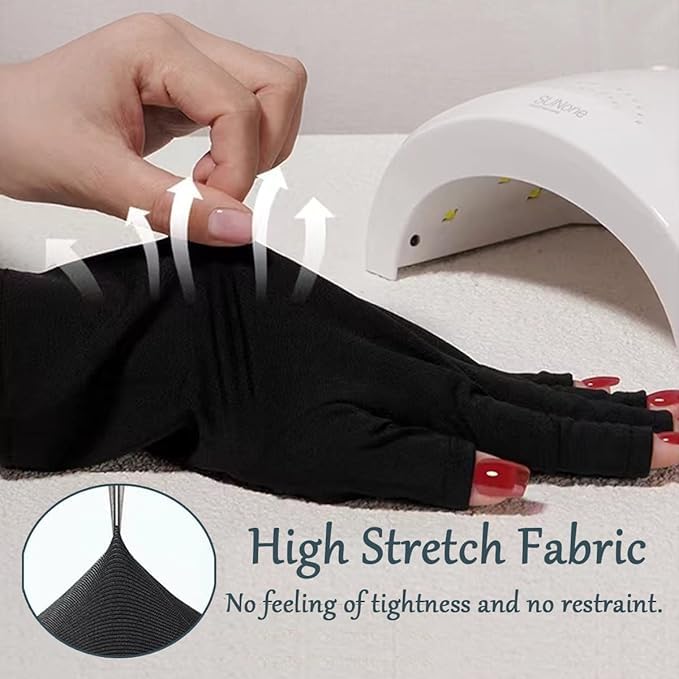 - حماية البشرة: يمكن أن تسبب الأشعة فوق البنفسجية خشونة الجلد والشيخوخة. معظم مصابيح معالجة الأظافر عبارة عن مصابيح بالأشعة فوق البنفسجية والاستخدام المنتظم لمصابيح الأظافر بدون حماية يمكن أن يتسبب في تغير لون البشرة وجفافها وزيادة الخشونة. تحمي القفازات الواقية من الأشعة فوق البنفسجية يديك بفعالية من الأشعة فوق البنفسجية التي تسببها مجففات الأظافر.