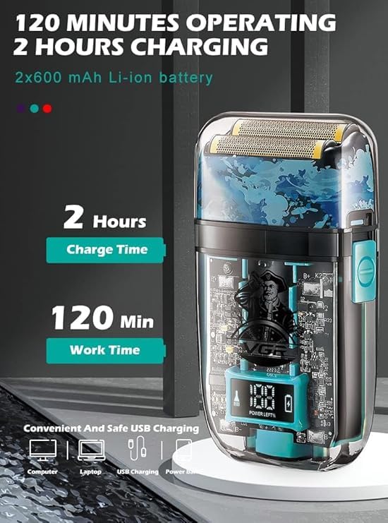 - شحن سريع USB: يتم شحن الماكينة بالكامل في ساعة ونصف فقط، مما يوفر لك 100 دقيقة من الحلاقة المتواصلة.