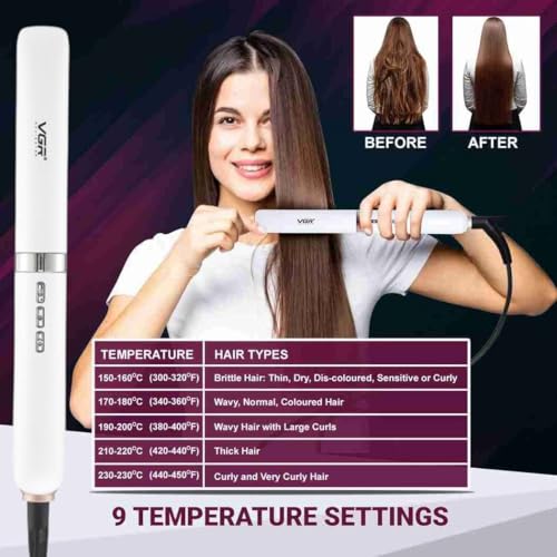 - خاصية التحكم في درجة الحرارة: تتميز بـ 9 إعدادات لدرجة الحرارة قابلة للتعديل من 150 درجة مئوية إلى 230 درجة مئوية لجميع أنواع الشعر، من الشعر الناعم إلى الكثيف والمجعد.