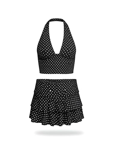 Generic - طقم رقبة على شكل حرف V - طقم انيق من قطعتين للنساء مع بلوزة برقبة على شكل حرف V وتصميم بدون ظهر وتنورة متعددة الطبقات لحركة رشيقة وتصميم متعدد الاستخدامات من النهار الى الليل