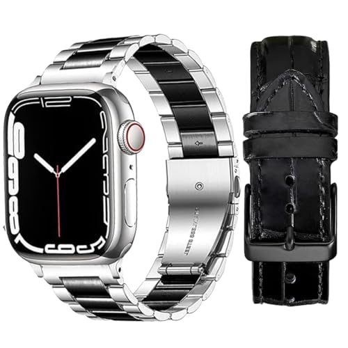 V Volt - سوار ساعة معدن من الفولاذ المقاوم للصدأ مع سوار جلد ناعم بتصميم فريد متوافق مع ساعة اي ووتش سلسلة 1/2/3/4/5/6/7/8/9/اس اي والترا/الترا 2 مقاس 42 ملم 44 ملم 45 ملم 49 ملم من في فولت، 1 عبوة من 2 قطعة