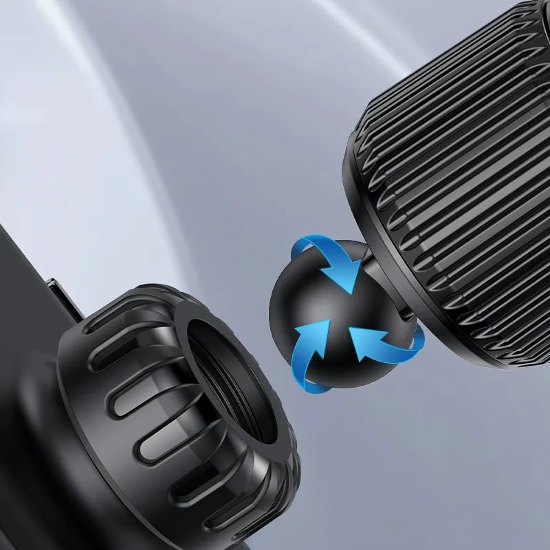 - [رأس دوار 360 درجة لرؤية مرنة:] : يوفر رأس الحامل إمكانية تدوير الهاتف بزاوية كاملة 360 درجة، مما يسمح باستخدامه أفقيًا أو عموديًا حسب الحاجة، لرؤية مثالية أثناء القيادة.