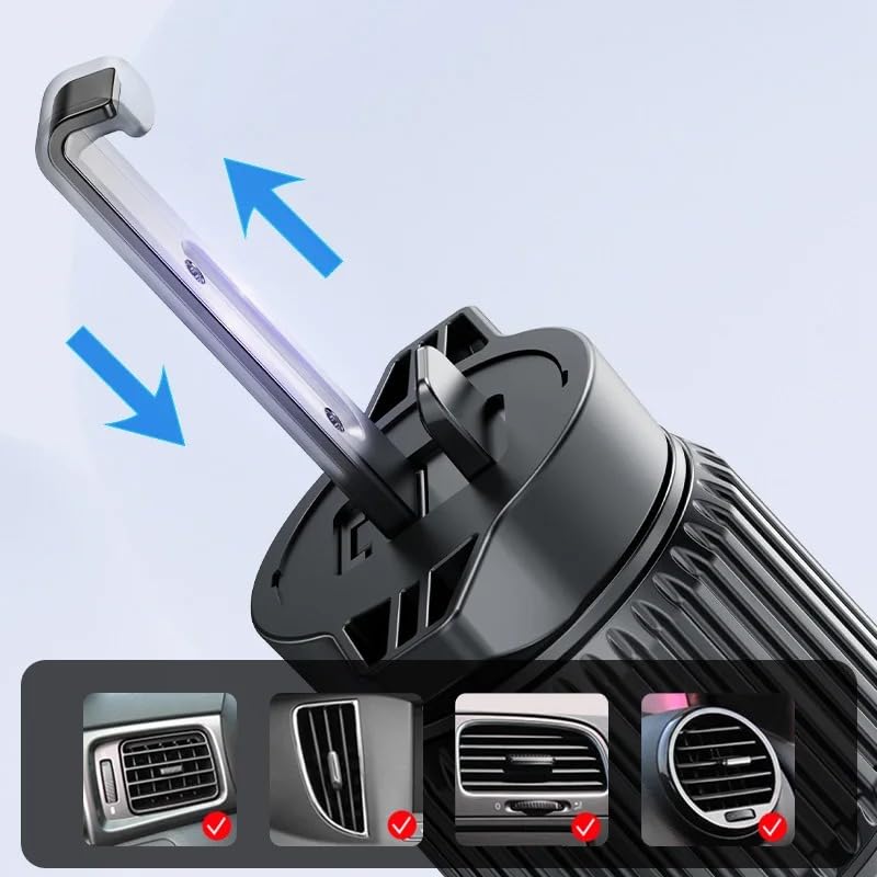 - [يُثبت على فتحة مكيف السيارة:] : يتم تركيبه مباشرة على فتحات التهوية دون الحاجة لأي أدوات، تصميمه الذكي يثبت الحامل بإحكام دون التأثير على تدفق الهواء أو ديكور السيارة.