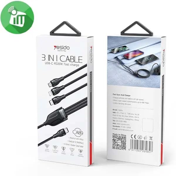 • كابل شحن سريع 3 في 1 يدعم شحن أجهزة متعددة في وقت واحد، بمنفذ USB-C PD بقدرة 20 واط لتوفير طاقة فعالة وسريعة.