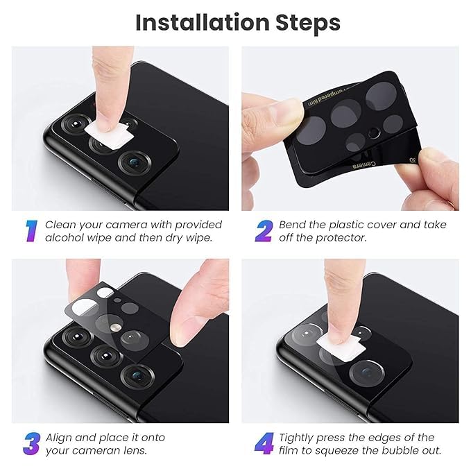 - [تركيب سهل وخالٍ من الفقاعات:] يتميز الواقي بتقنية لاصقة ذكية تجعل عملية التركيب بسيطة وسريعة، بدون ظهور فقاعات هواء أو غبار، مما يضمن تثبيتًا متينًا ومتناسقًا يحمي العدسة بأعلى كفاءة.
