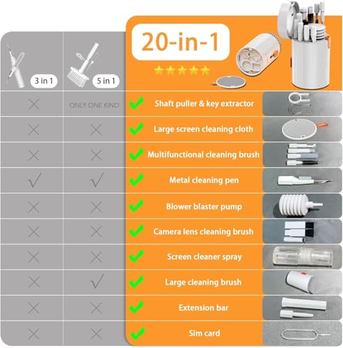 - [مجموعة تنظيف متكاملة 20 في 1]: تحتوي المجموعة على كل ما تحتاجه للحفاظ على نظافة أجهزتك بدقة واحترافية، فهي تضم أدوات متعددة الاستخدامات مثل الفرش الدقيقة، والمناديل، وأعواد التنظيف، لتمنحك أداءً متكاملاً في إزالة الغبار والأتربة من أصعب الأماكن بسهولة وفعالية دون إتلاف السطح.