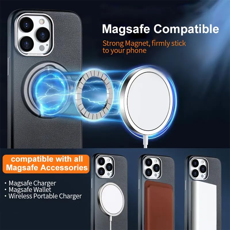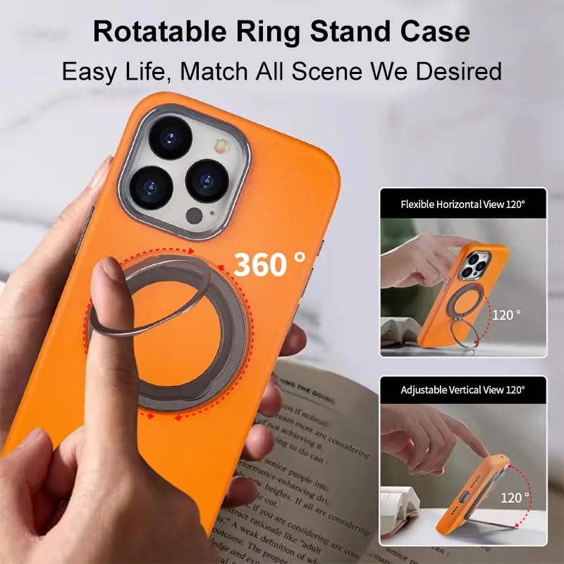 V Volt - جراب جلد من في فولت - حماية مضاد للصدمات - سحب دوار باطار معدني - يدعم الشحن اللاسلكي متوافق مع ايفون 15 برو ماكس برتقالي