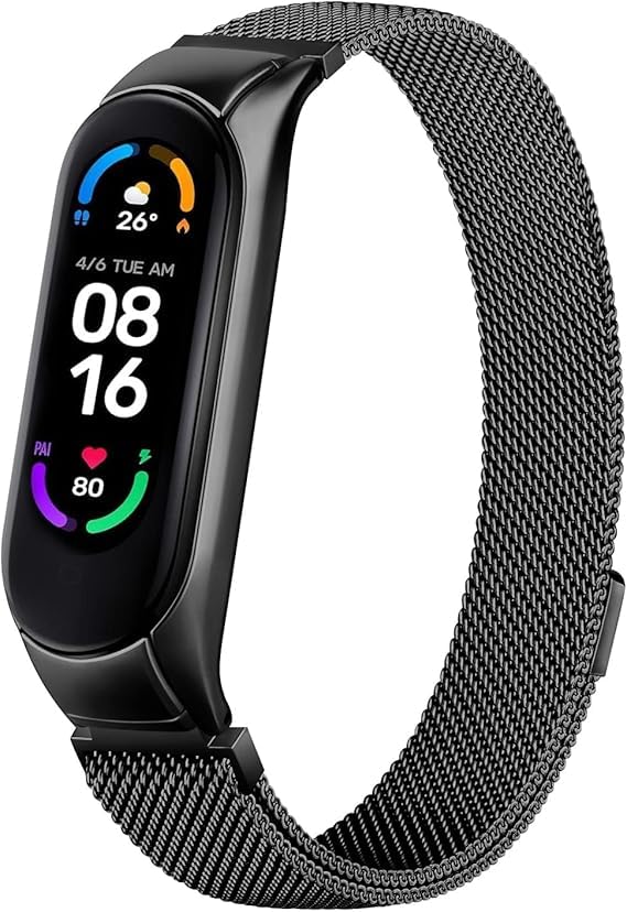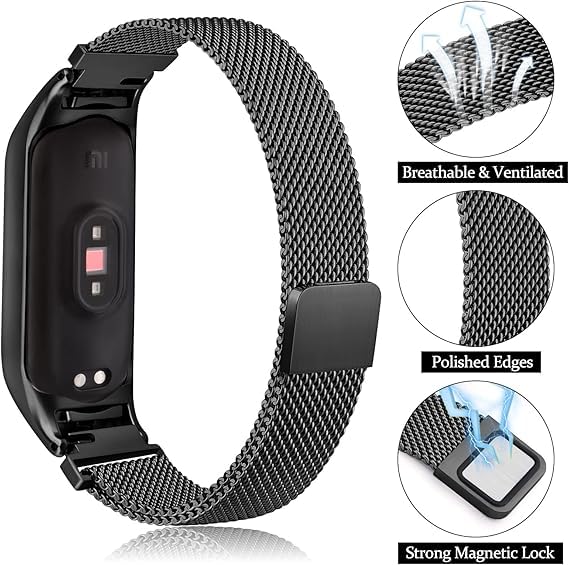 V Volt - سوار معدني متوافق مع شاومي مي باند 5/6 / امازفيت باند 5/6 - سوار من الفولاذ المقاوم للصدأ قابل للتعديل مع مشبك مغناطيسي جيد التهوية للرجال والنساء من في فولت، أسود