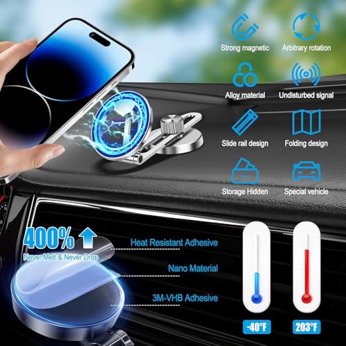 - 【تشغيل سهل بيد واحدة】 مصمم للأمان والراحة. يتيح لك الاتصال المغناطيسي تثبيت هاتفك أو إزالته فوراً بيد واحدة. تضمن القاعدة اللاصقة القوية (من نوع 3M) بقاء الحامل مثبتاً بقوة على لوحة القيادة أو الكونسول دون ترك بقايا لزجة عند الإزالة.
