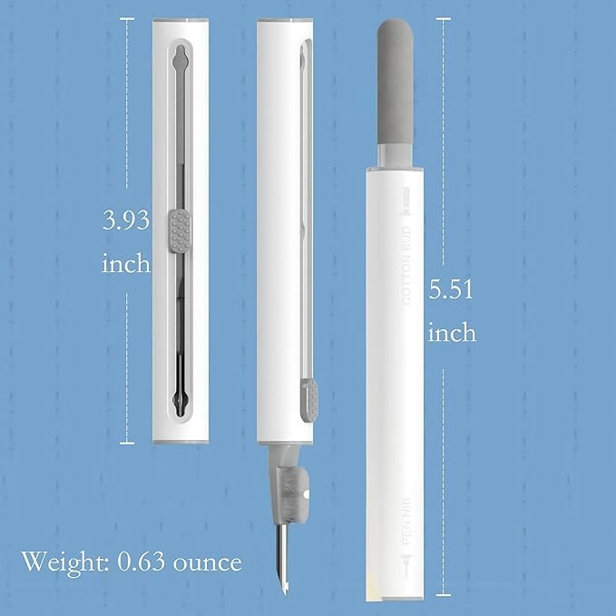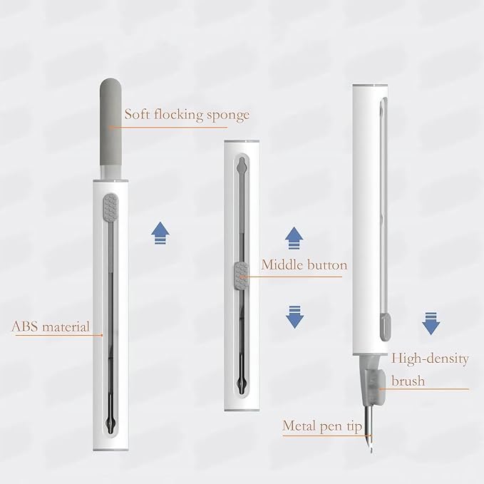 - [تصميم 3 في 1]: يأتي هذا القلم الذكي مزودًا برأس معدني للتنظيف الدقيق، وفرشاة ناعمة، وأداة إسفنجية لتنظيف العلبة من الداخل، مما يمنحك تجربة تنظيف شاملة دون إتلاف السماعات.