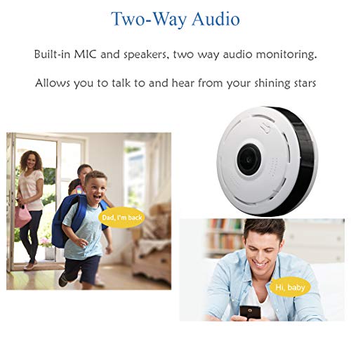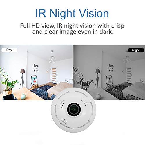 - رؤية 360 درجة: تمنحك عدسة عين السمكة التي تعمل بالواي فاي الحماية والأمان اللذين تحتاجهما، وذلك بفضل عدسة الكاميرا ذات الزاوية الواسعة. يوفر منظر عين السمكة مراقبة بانورامية من جميع الزوايا للحفاظ على سلامتك وسلامة عائلتك أو عملك.