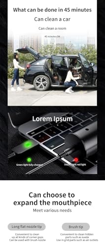 - 1、قوة شفط أقوى: تتميز المكنسة الكهربائية المطورة للسيارة بقوة أعلى 120 واط وسعة بطارية 2000 مللي امبير في الساعة، وقوة شفط أقوى تبلغ 5500 باسكال ودوران أسرع لعجلة المروحة، والتي يمكنها بسهولة تنظيف بعض الغبار والقمامة المرئية أو غير المرئية في السيارة.