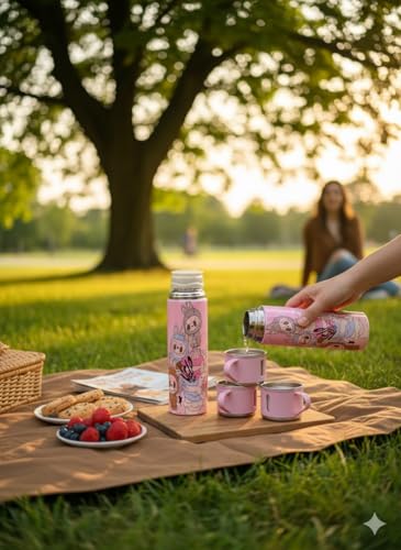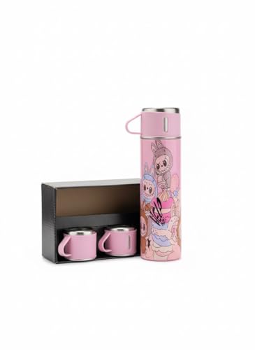 Generic - فاكيوم فلاسك سيت قارورة حرارية عائلية، ستانلس ستيل وردي مع رسوم كرتونية، 500 مل مع 3 أكواب، حافظة للحرارة 12 ساعة، طقم 4 قطع
