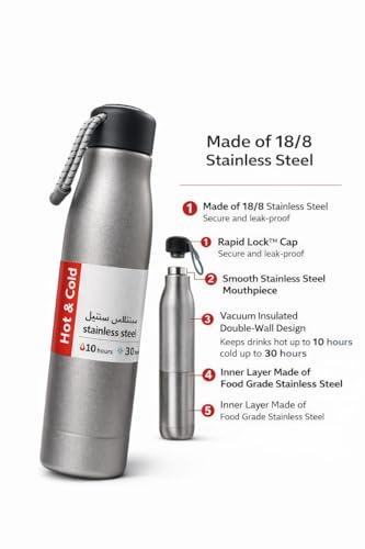 - غطاء محكم الإغلاق: مزودة بغطاء Rapid Lock محكم ومانع للتسرب مع فوهة من الفولاذ المقاوم للصدأ الناعم لسهولة الشرب