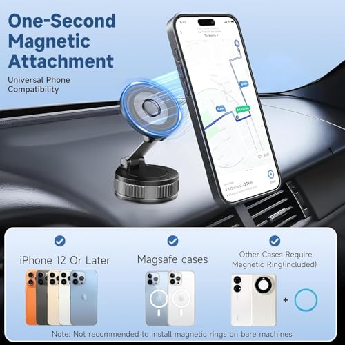 - توافق واسع مع معظم الهواتف الذكية: يتوافق حامل السيارة ماج سيف هذا تمامًا مع سلسلة ايفون 17/16/15/14/13/12 برو ماكس وجرابات ماج سيف. تضمن الحلقة المعدنية المتضمنة توافقًا عالميًا مع جميع جرابات هواتف ايفون واندرويد، بما في ذلك سامسونج جالكسي وموتورولا وجوجل بكسل وون بلس. ببساطة قم بتوصيل الحلقة المعدنية بالجزء الخلفي من حافظة هاتفك. للحصول على أقصى قدر من الثبات، يرجى ترك الخاتم يجف بالكامل لمدة ساعتين قبل الاستخدام. ملاحظة: لا يوصى بتركيب الحلقات المغناطيسية على الآلات العارية