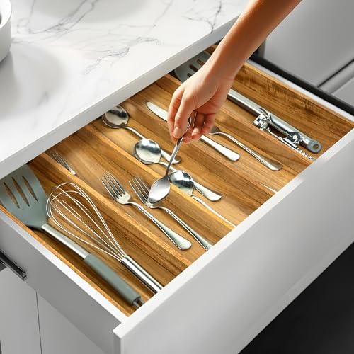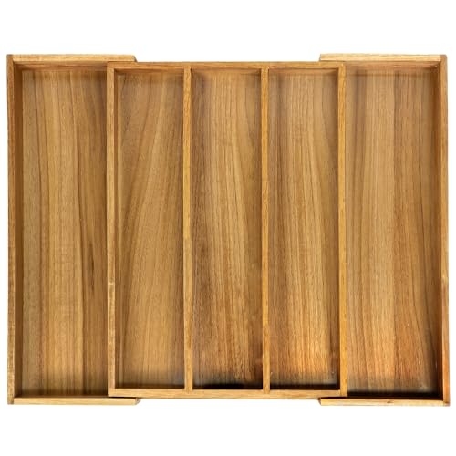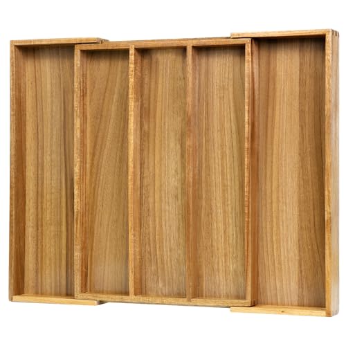 VaeFae - فاي فاي منظم ادوات المطبخ الفضية من اكاسيا، منظم درج ادوات تناول الطعام مع 5 اقسام، حامل ادوات مائدة خشبي لادوات المائدة وادوات الطبخ