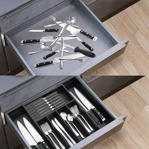 - احمل جميع أدوات المطبخ وأدوات المائدة وأدوات المائدة غير مرئية في الدرج. يحتوي منظم أدراج الأدوات الفضية الخشبي هذا على 5-7 مساحات تخزين كبيرة وحامل سكاكين قابل للإزالة لحمل السكاكين. يسهل العثور عليها في كل مرة تحتاج إليها