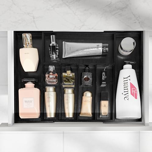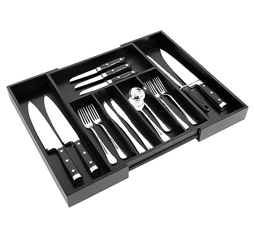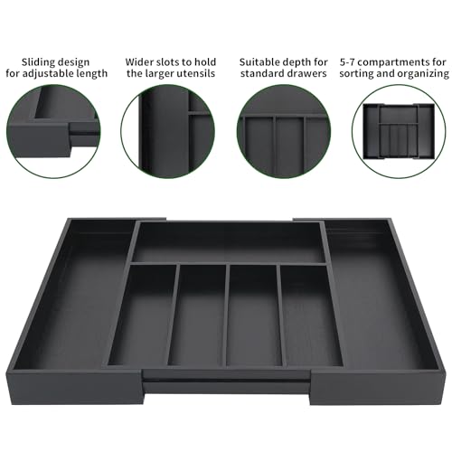 VaeFae - فاي منظم ادراج من الخيزران فضية قابل للتوسيع وصينية ادوات المائدة فواصل خشبية لاواني المطبخ وادوات اسود