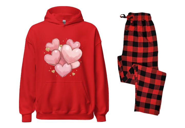 Generic - طقم بيجامة عيد الحب، هودي احمر مع بنطلون منقوش بقلوب وردية، قطعتين مقاس (L)