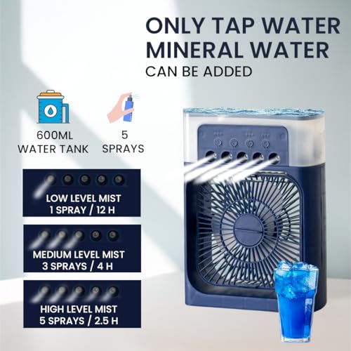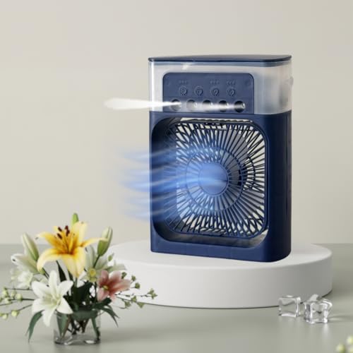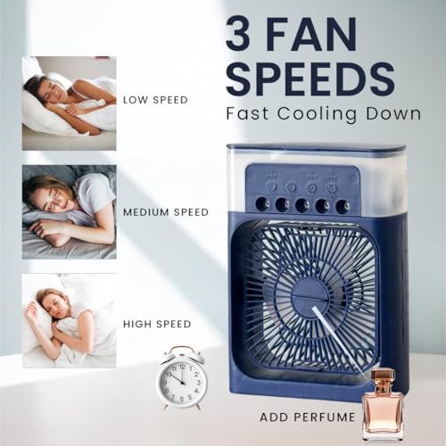 VALOREX - مبرد هواء صغير مزود بإضاءة ليد بسبعة ألوان، ومروحة مكتب بمنفذ USB، ومبرد تبخيري 3 في 1 للمنزل والمكتب والسفر - 3 سرعات للرياح، ومؤقت، وأوضاع رش (أزرق) من فالوريكس