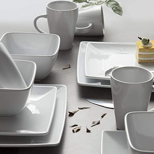 vancasso - طقم عشاء مربع من الخزف الحجري مكون من 48 قطعة، طقم أدوات مائدة بلون أبيض، طقم أواني مطبخ مع طبق عشاء وطبق حلويات وبولات ومج، مناسب لـ 12 شخص من فانكاسو سوهو