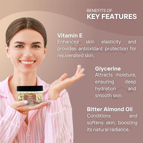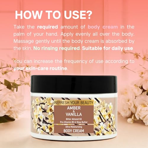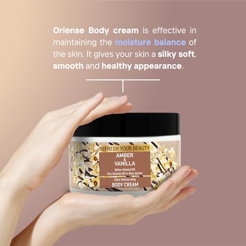 Oriense - كريم الجسم الغني بالفانيليا والعنبر - زيت اللوز المر وزبدة الشيا والجليسرين والبانثينول وفيتامين E يوفر تغذية معززة - تركيبة غنية بالتغذية
