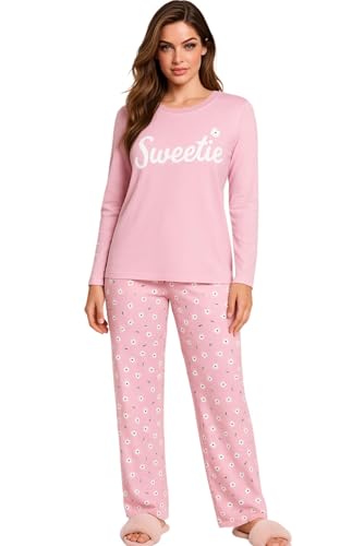 VNL by Vanilla - طقم بيجامة للنساء مطبوع عليه زهور وردية من فانيلا، بلوزة باكمام طويلة مع بنطلون منقوش، ملابس نوم مريحة كود 3435