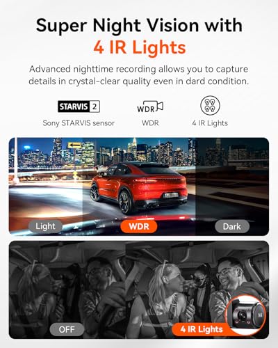 - 【كاميرا سيارة للرؤية الليلية بالأشعة تحت الحمراء للسائقين】مع جهاز استشعار ستارفيس CMOS عالي الأداء، ومقاس فتحة عدسة كبيرة F1.4 وعدسة من 6 طبقات زجاجية لمراقبة الطريق الأمامي، وعدسة من 6 طبقات زجاجية F1.8 للمراقبة الطريق الخلفي، تستطيع كاميرا السيارة زيادة التعرض الضوئي تلقائيًا في الأماكن المظلمة لالتقاط مقاطع فيديو واضحة؛ مزود بـ 4 مصابيح إضاءة ليد بالأشعة تحت الحمراء تواجه مقصورة السيارة، والتي يمكنها التقاط السائق والركاب بدقة حتى إن كانت المقصورة مظلمة تمامًا، مناسبة لسائقي تطبيقات النقل الذكي مثل اوبر وليفت وتاكسي.