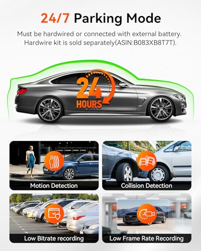 - 【وضع مراقبة وقوف السيارة على مدار 24 ساعة】 ستواصل كاميرا تابلوه السيارة التسجيل باستمرار وتقلل من جودة الفيديو لزيادة كمية التسجيل عند استخدام وضع مراقبة وقوف السيارات بمعدل بت منخفض. بينما تسمح تقنية كشف الحركة أو كشف الاصطدام التي تعمل في وضع الوقوف للكاميرا ببدء التسجيل تلقائيًا عند تفعيلها بسبب استشعار حركة أو حدث تصادم. يجب توصيل كاميرا تابلوه السيارة ثلاثية القنوات بمجموعة أسلاك التوصيل في جميع الأوقات أو ببطارية خارجية.