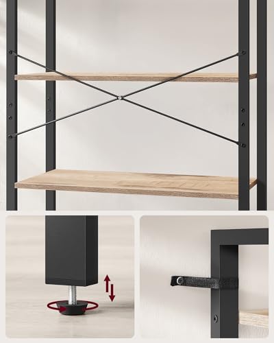 - [ثابت وآمن] قضبان على شكل حرف X تعزز الهيكل، أقدام قابلة للتعديل تحافظ على رف الكتب المكون من 6 طبقات متوازنًا على الأرضيات غير المستوية قليلاً، وستساعدك المجموعة المتضمنة المضادة للانقلاب على تثبيته على الحائط لمزيد من الثبات والأمان