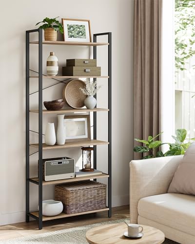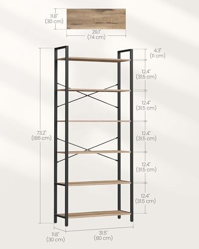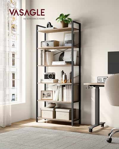 VASAGLE - وحدة أرفف طويلة كبيرة مع إطار ستيل قائمة بذاتها من 6 فاساجيل للكتب وغرفة المعيشة النوم والمكتب المنزلي والدراسة 30 × 80 186 سم صناعي بني جملي وحبر أسود LLS082B50