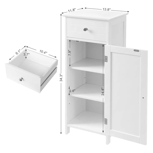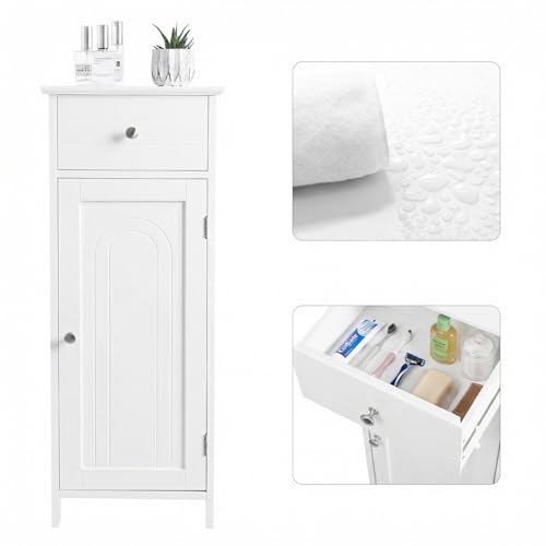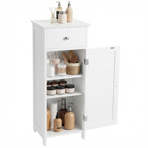 VASAGLE - دولاب أرضية الحمام، وحدة تخزين خشبية مع درج ورف قابل للتعديل لغرفة المعيشة من فاساجيل- أبيض