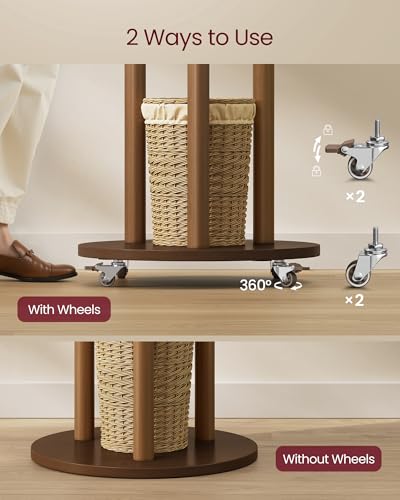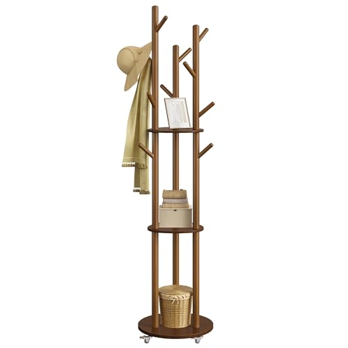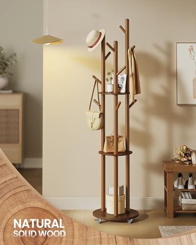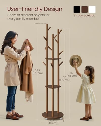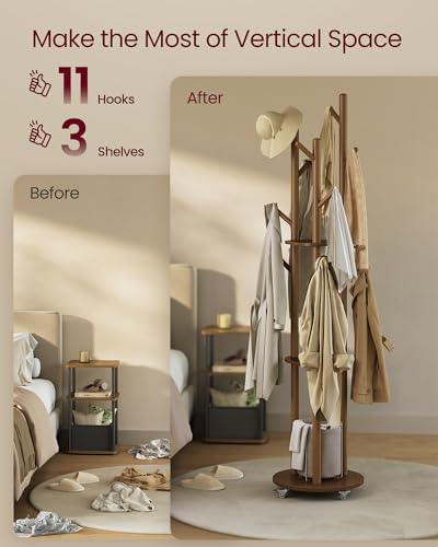 VASAGLE - فاساجيل حامل معاطف قائم بذاته، شجرة معطف مع 11 خطاف، 3 ارفف، 4 عجلات دوارة 360 درجة قابلة للازالة، خطافات واعمدة خشبية، للمدخل، غرفة النوم، غرفة المعيشة، بني جوزي URCR023K01