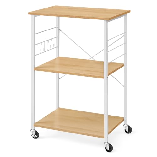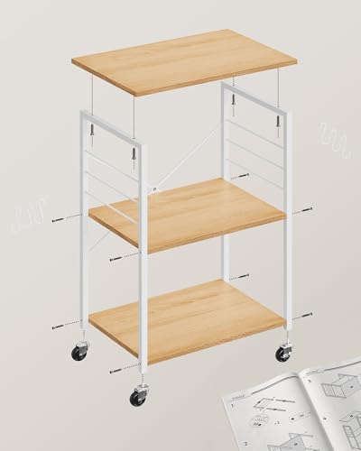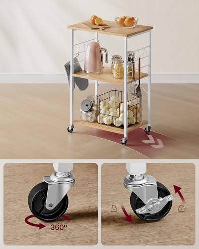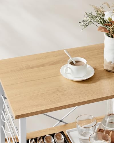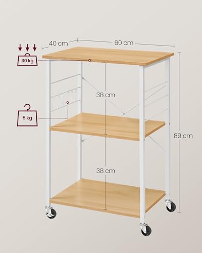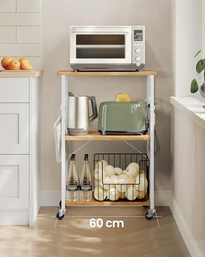 VASAGLE - فاساجيل عربة مطبخ بعجلات KKS060Y09، عربة تقديم مع 3 ارفف، فرن ميكروويف، محمصة، هيكل معدني مع 6 خطافات، عصرية، بلوط ذهبي وابيض كلاود